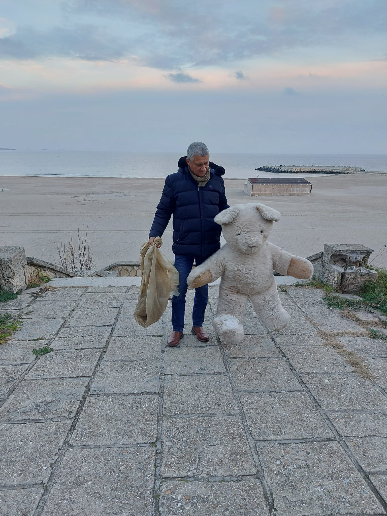 In zona de plaja a Dunelor Marine Agigea - Eforie Nord am gasit aruncat un ursulet de plus. Mare, frumos dar rupt, murdar, devenit "gunoi" si care aproape sigur urma sa ajunga in apa Marii.